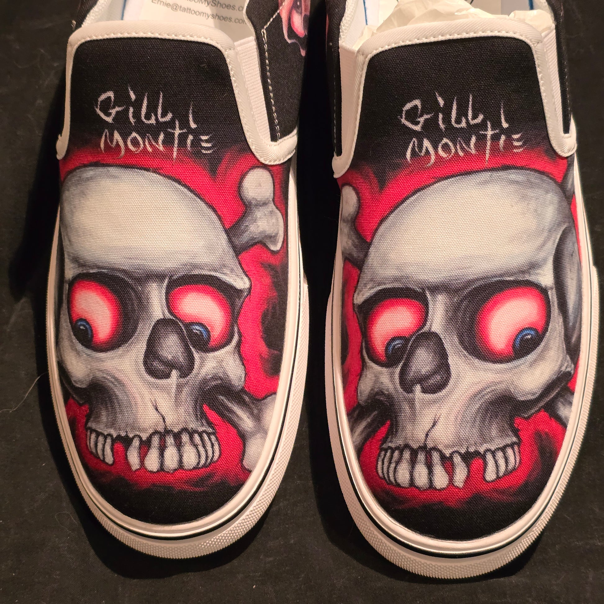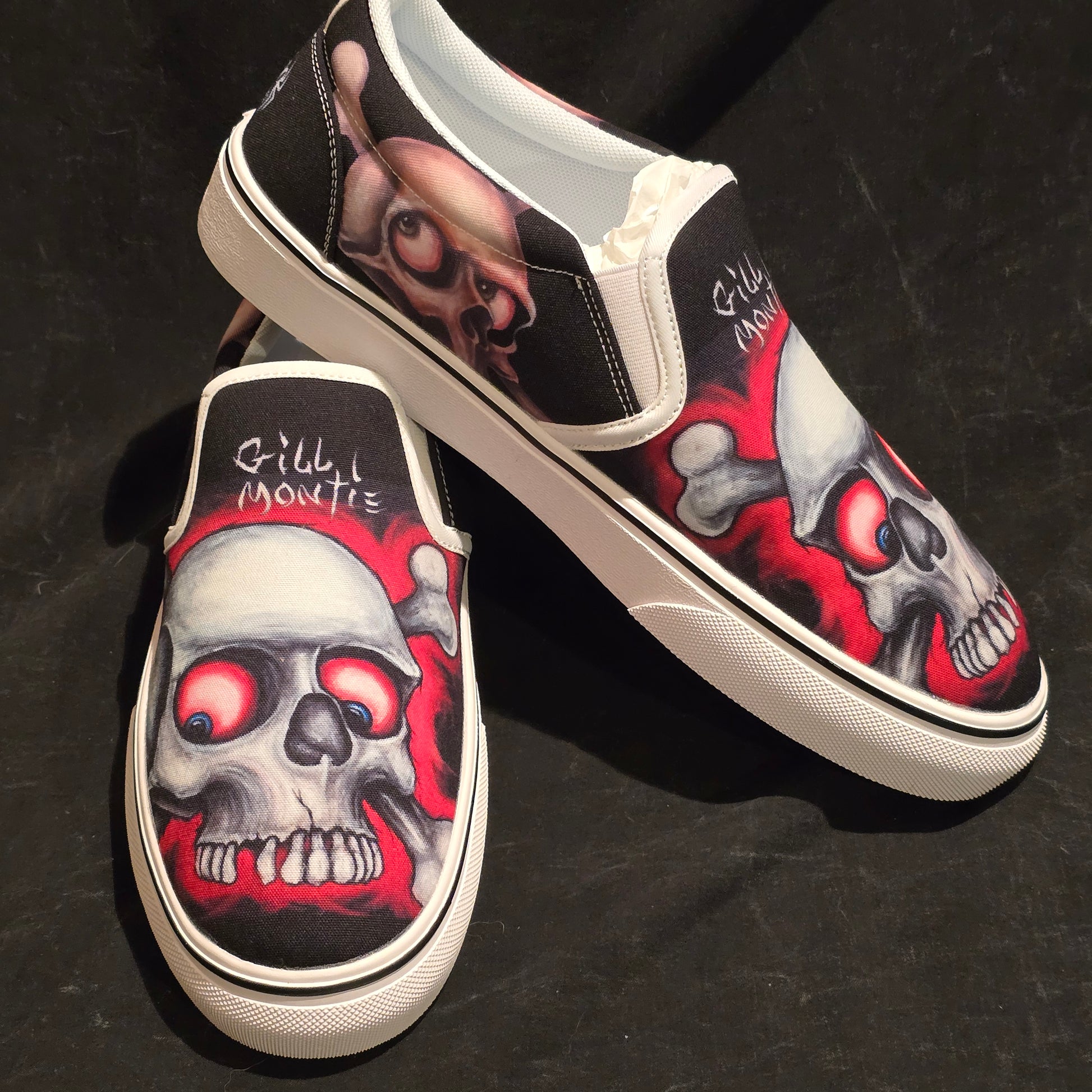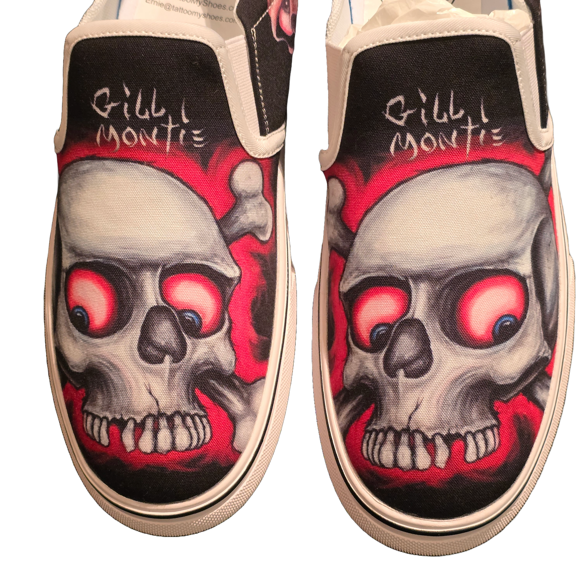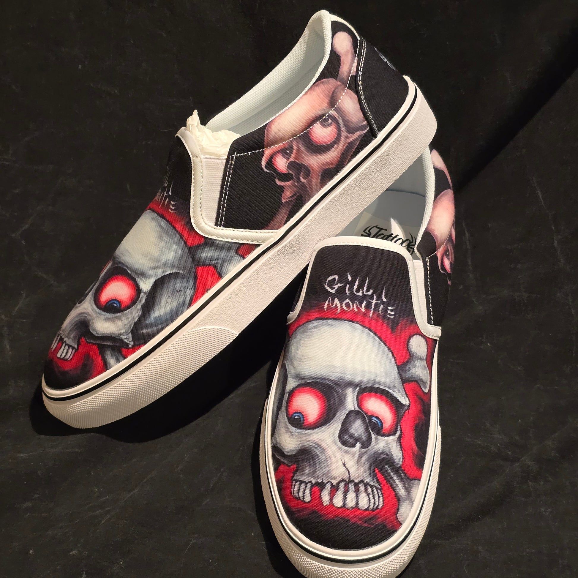 Step up your shoe game with these Gill Montie - Red Skulls Slip Ons Shoes! These kicks will take your style to the next level with their unique design featuring red skulls on the Tattoo My Shoes brand. Slip on these shoes and show off your edgy side.