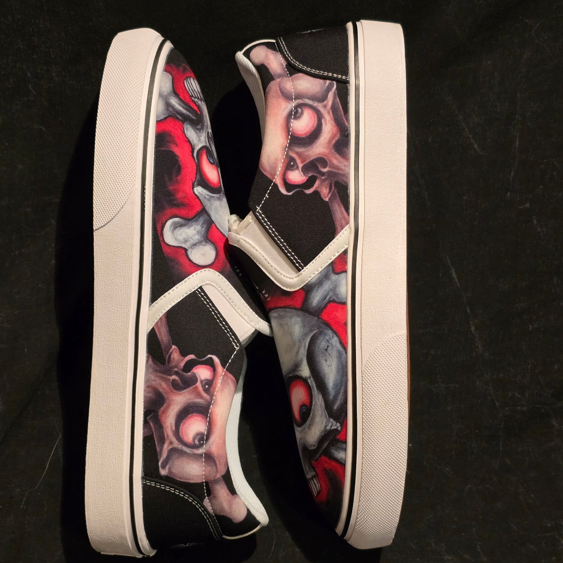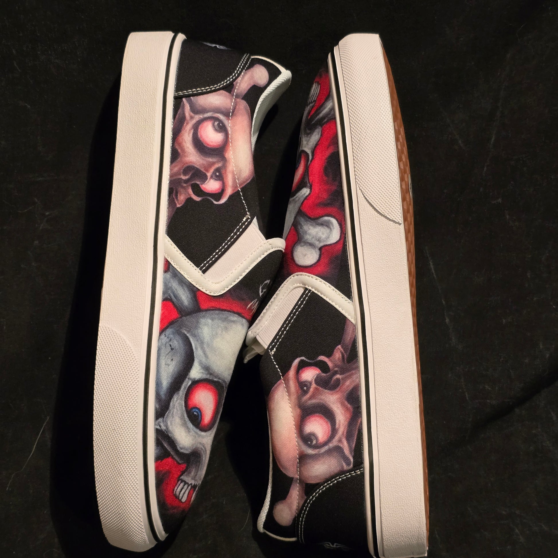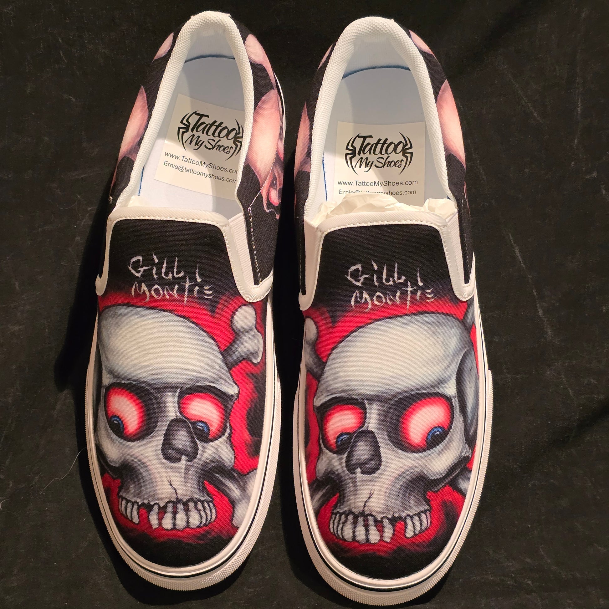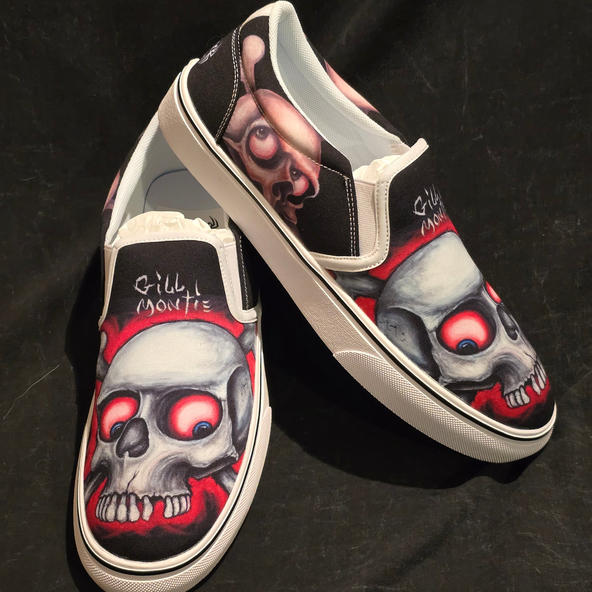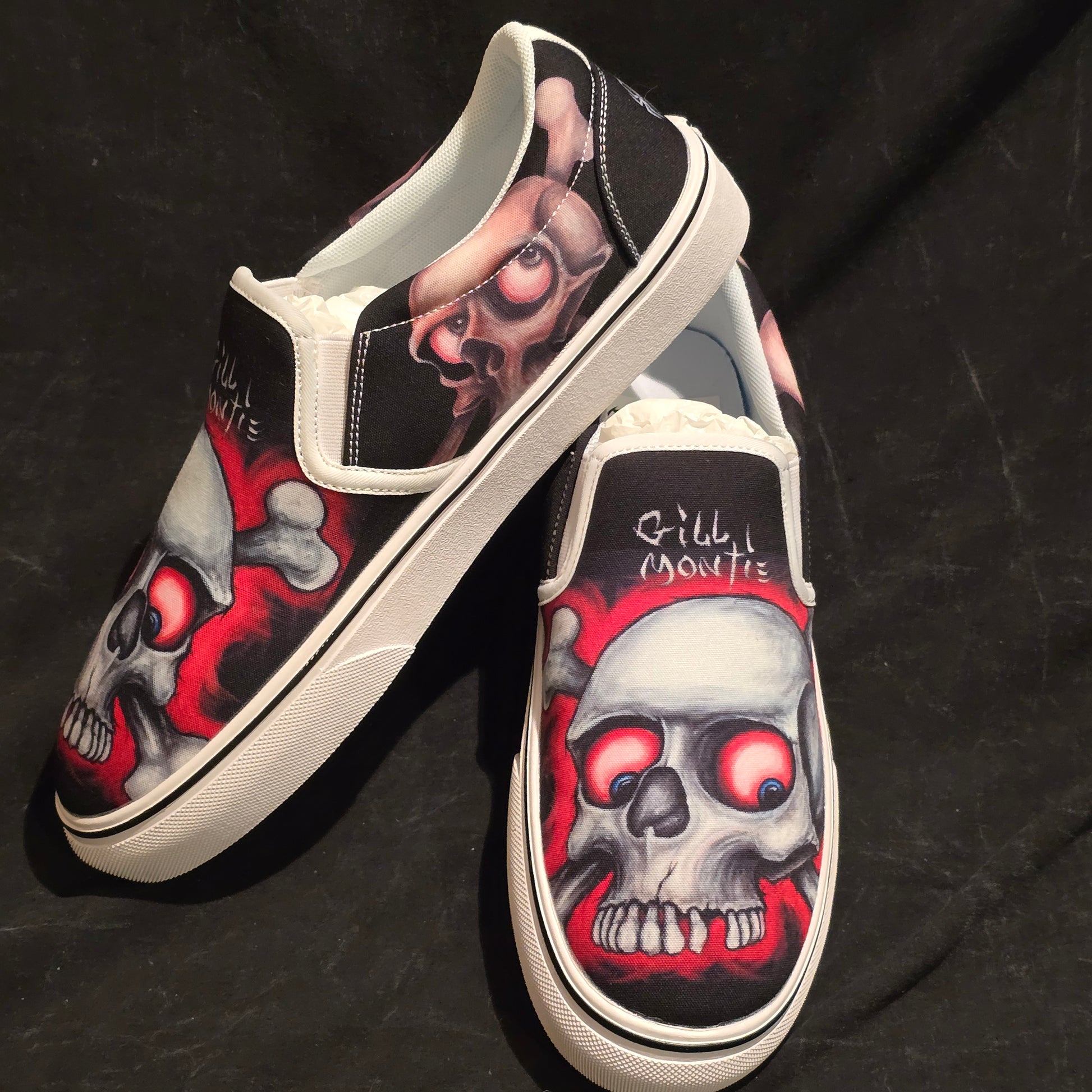 Step up your shoe game with these Gill Montie - Red Skulls Slip Ons Shoes! These kicks will take your style to the next level with their unique design featuring red skulls on the Tattoo My Shoes brand. Slip on these shoes and show off your edgy side.