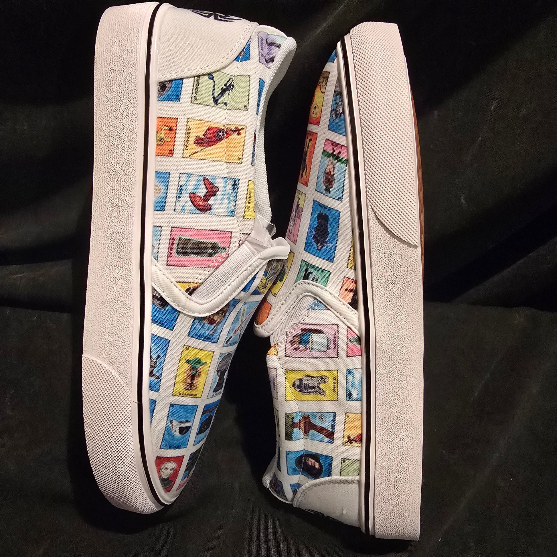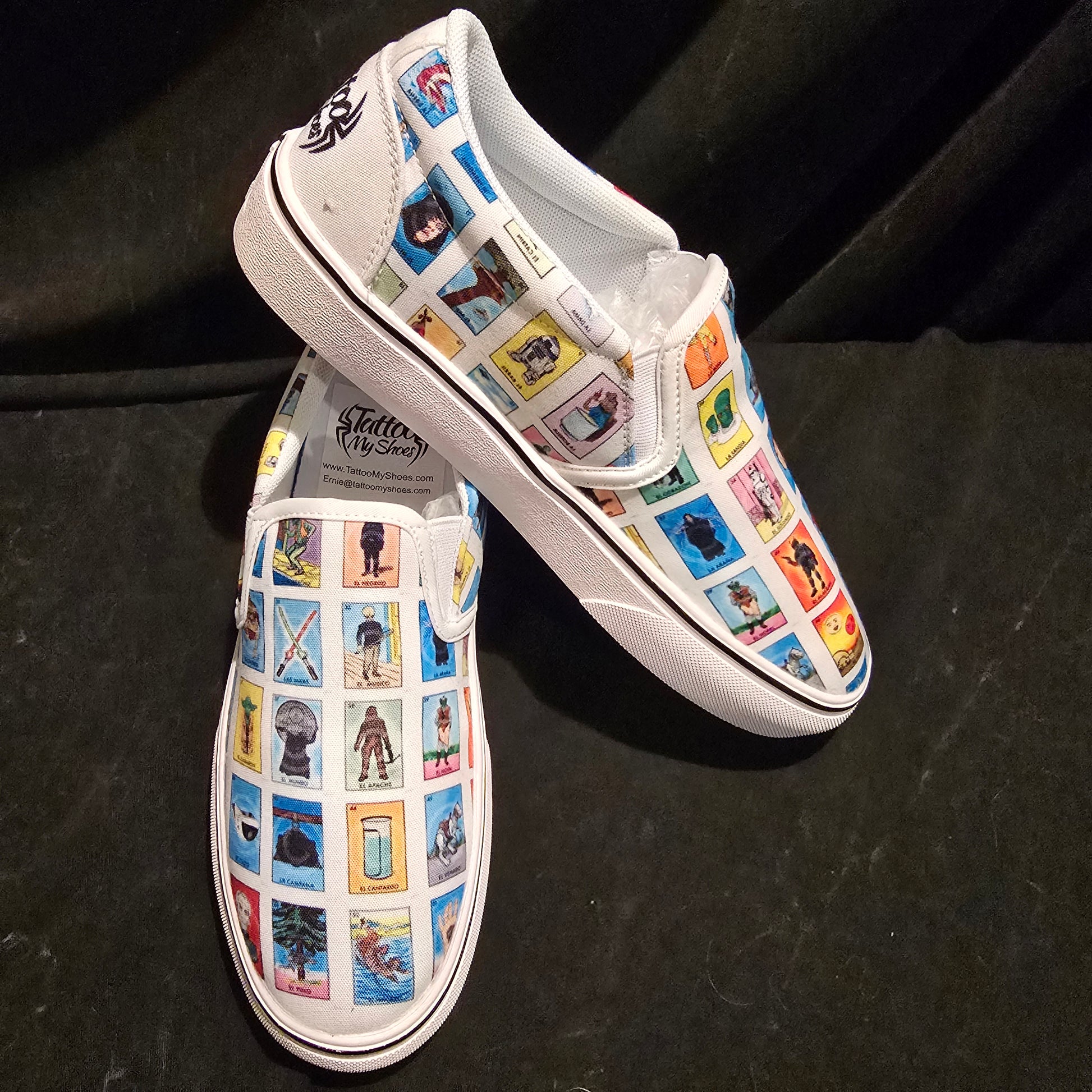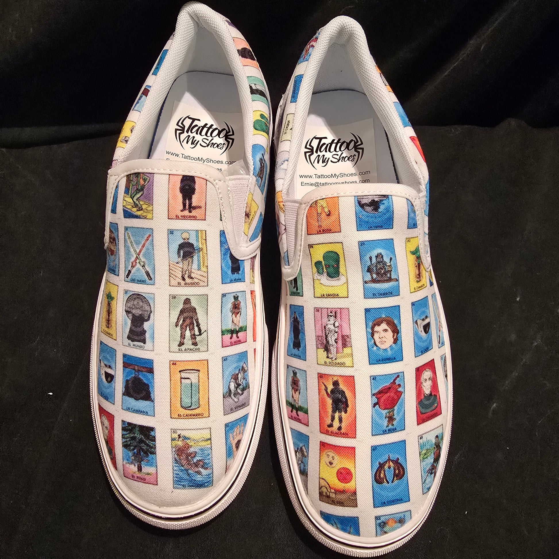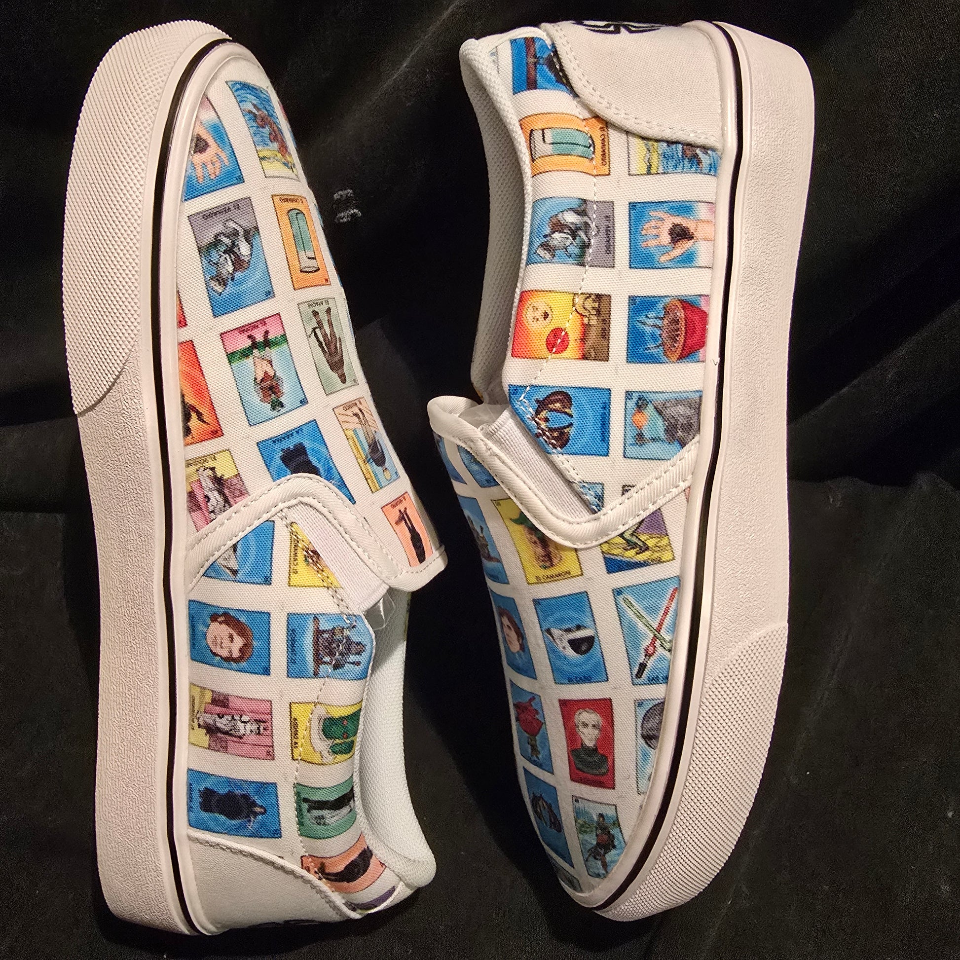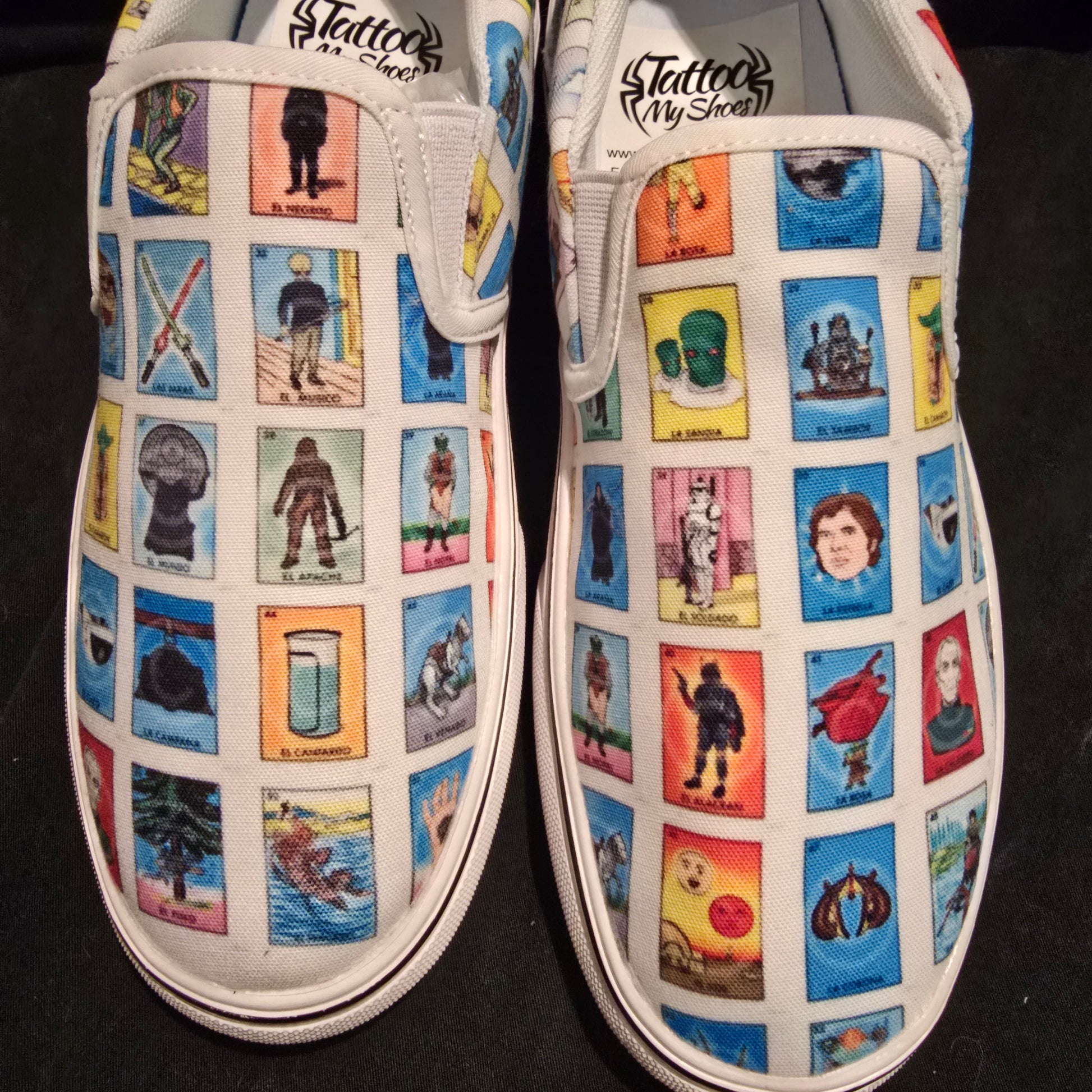 Add a little bit of the galaxy to your style with Loteria Star Wars slip on shoes. Trendy, classy, and customizable with the iconic Star Wars figures from the classic game Loteria. Tattoo my shoes feature allows for a one-of-a-kind shoe to make a statement.
