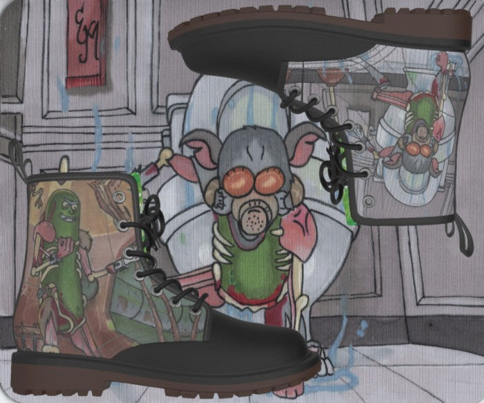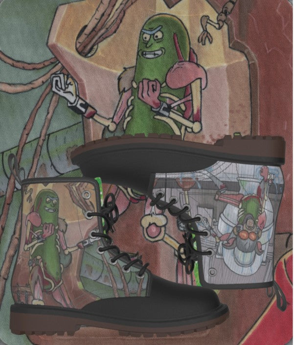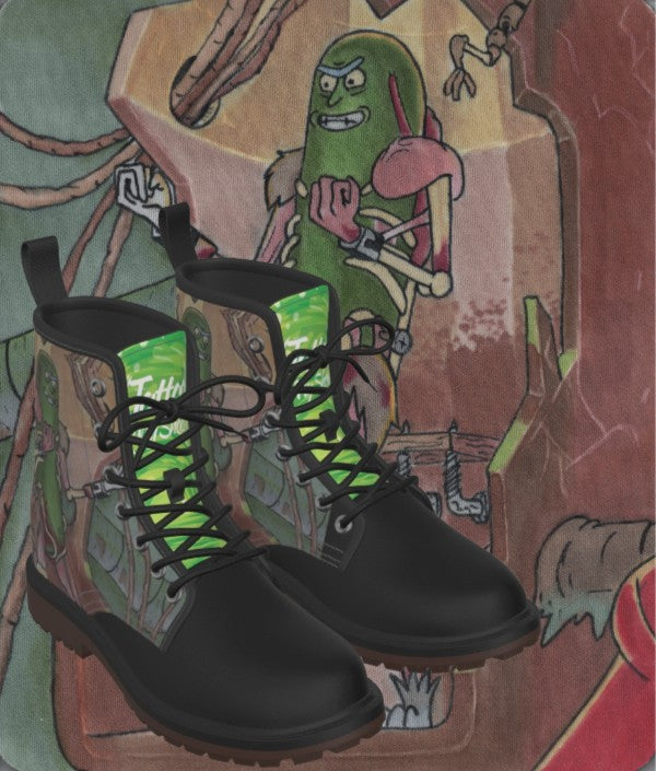 Step into bold style with these Pickle Rick Boots, featuring original hand-drawn fan art inspired by Rick and Morty. Each boot showcases a unique design on each side, crafted for durability and standout appeal. Perfect for fans who dare to wear their fandom loud and proud.