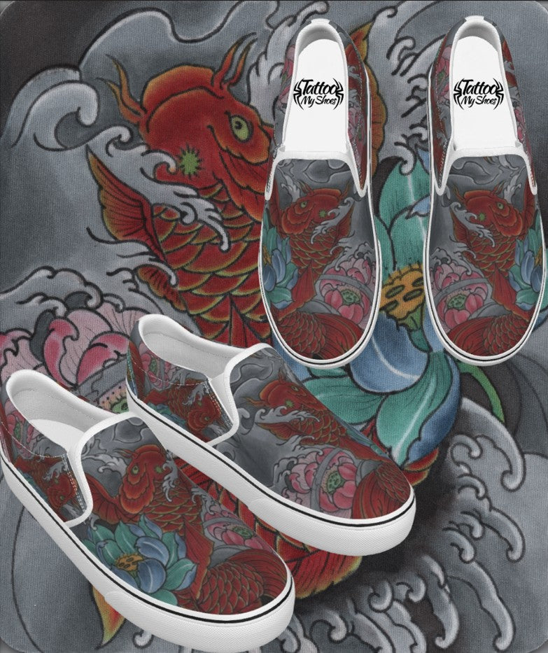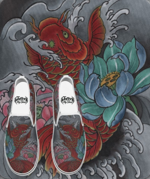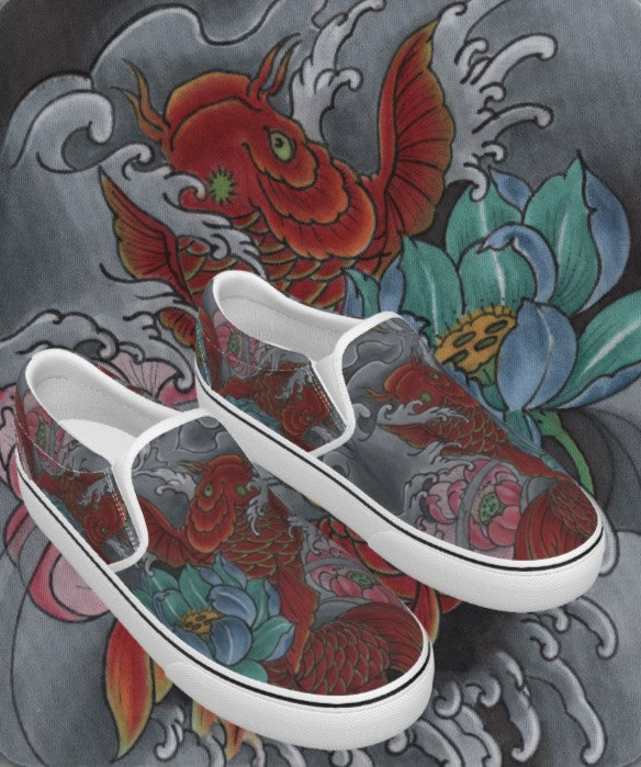 Make a bold statement with these Red Koi Slip Ons, featuring original hand-drawn art inspired by traditional Japanese koi. Symbolizing good luck and perseverance, their vibrant colors and unique design set you apart. Crafted for durability and machine washable convenience, these slip-ons combine fearless style with lasting comfort.