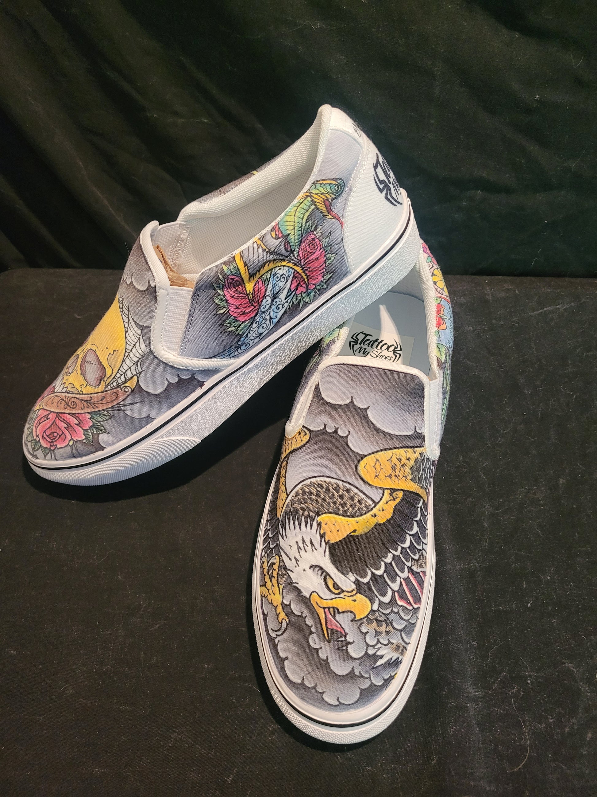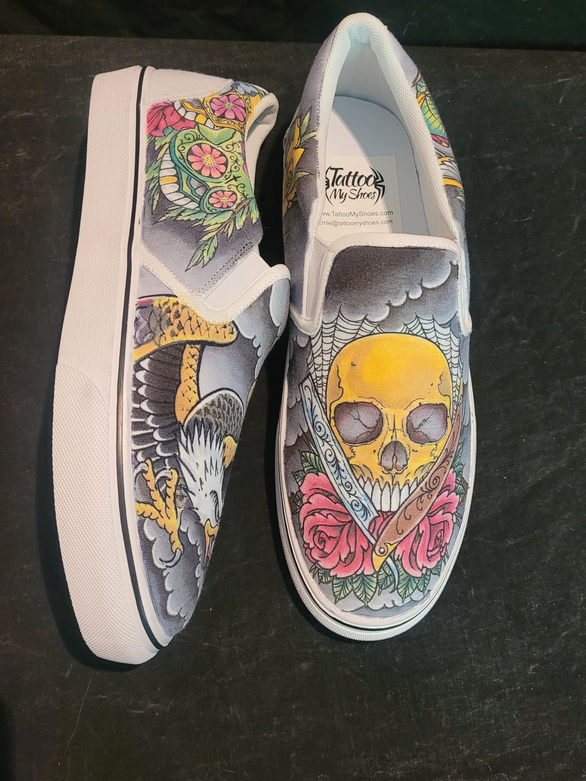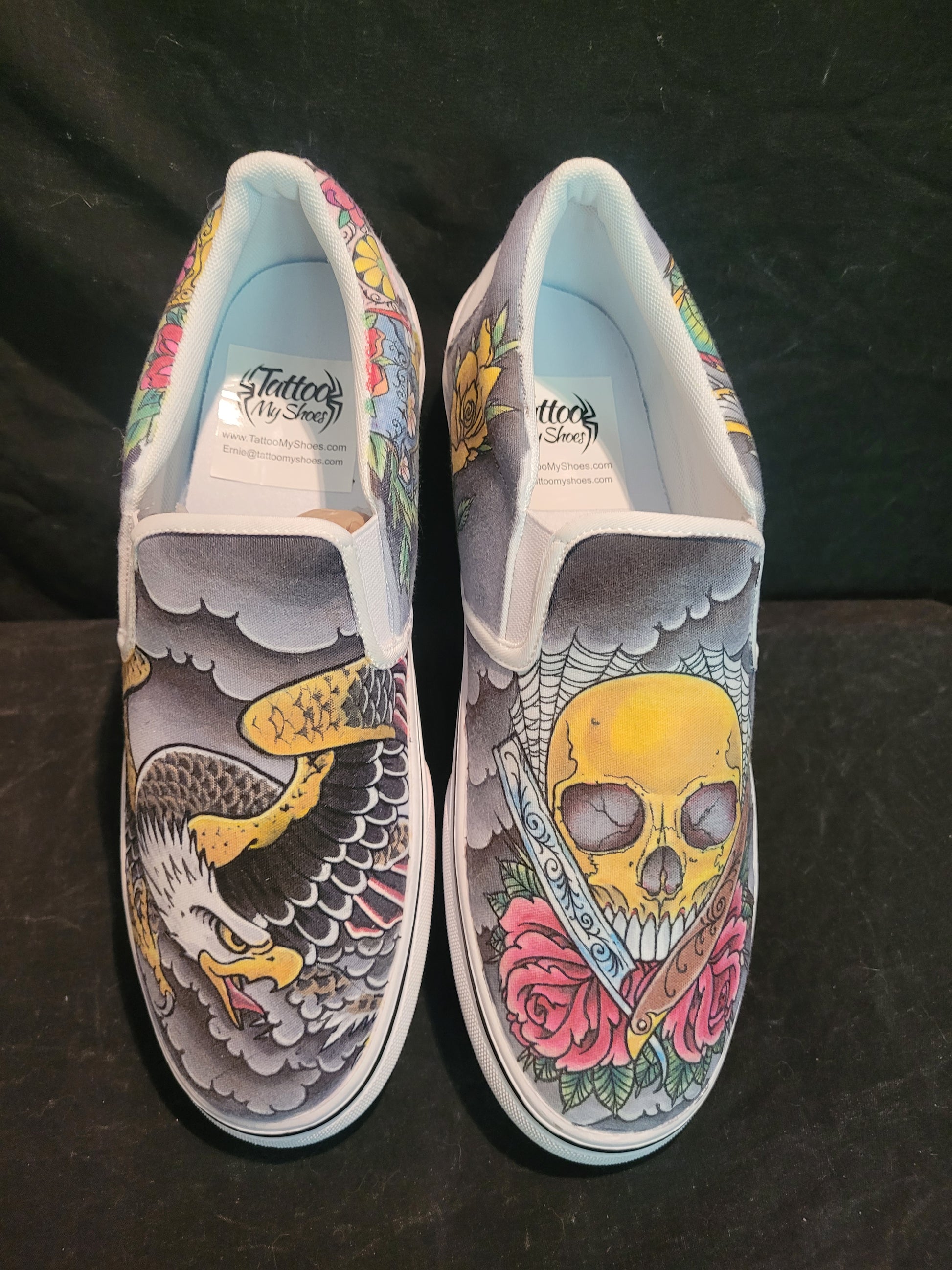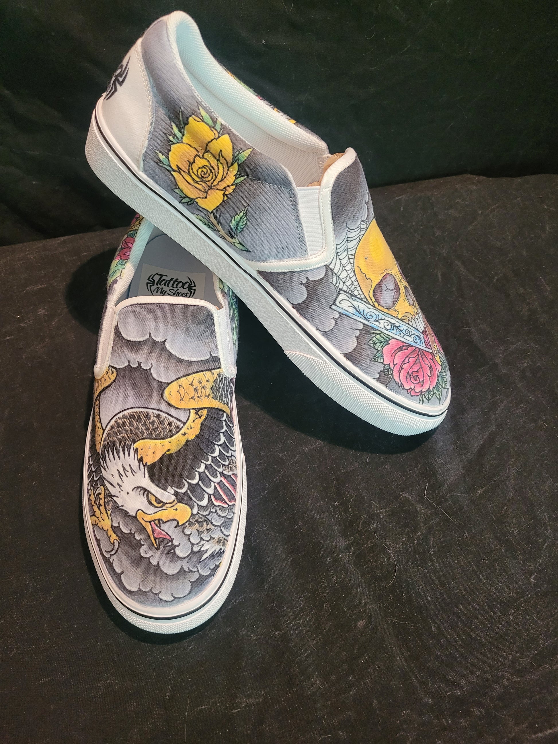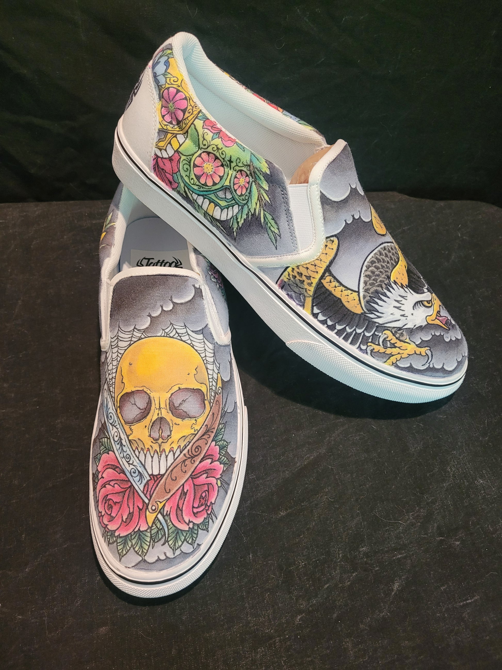 Elevate your style with these slip on shoes, featuring a stunning hand-drawn skull and eagle design by artist Ernie Moreno. Perfect for any tattoo lover, these shoes are sold exclusively by Tattoo My Shoes. Step out in unique, edgy style.