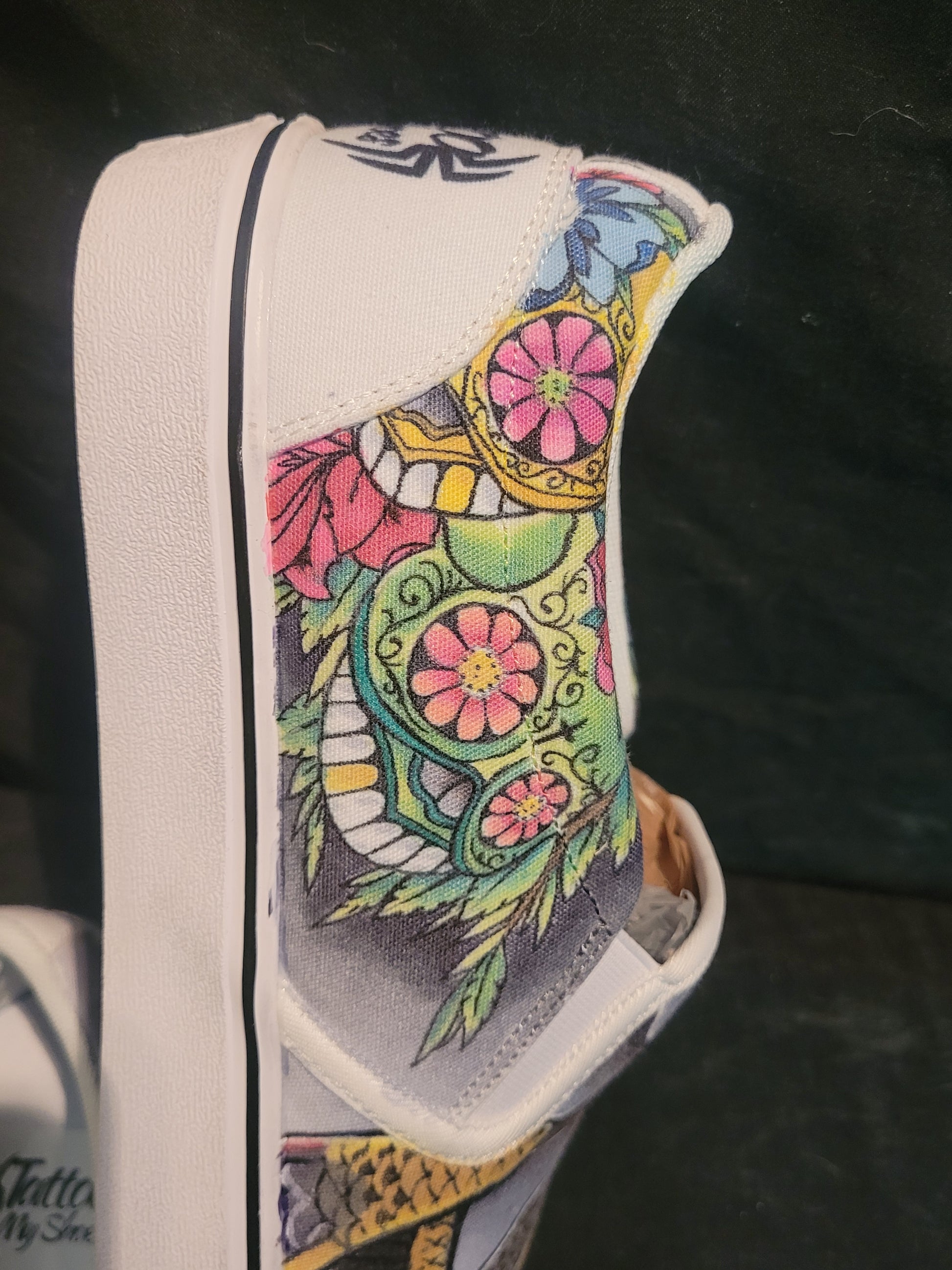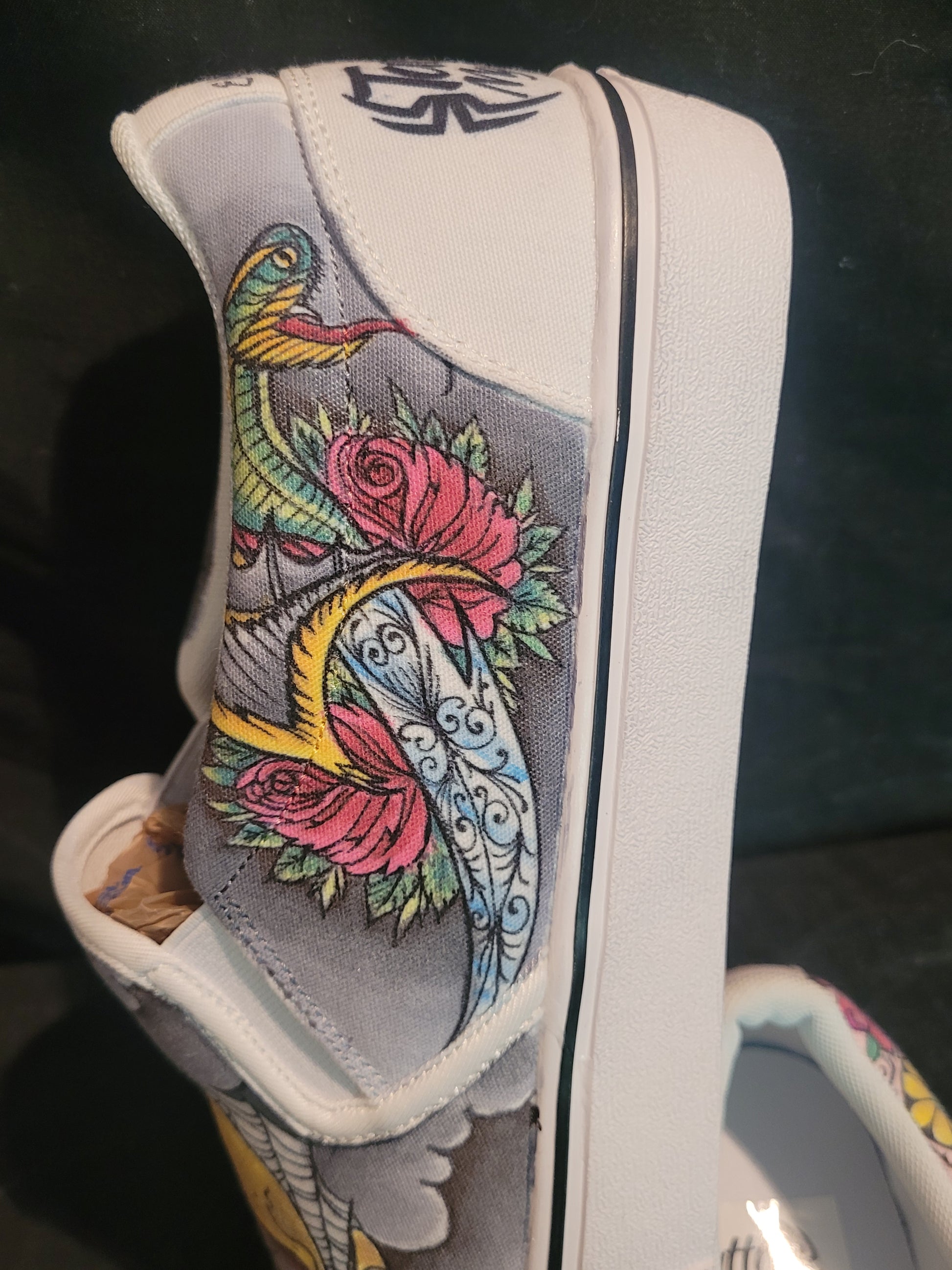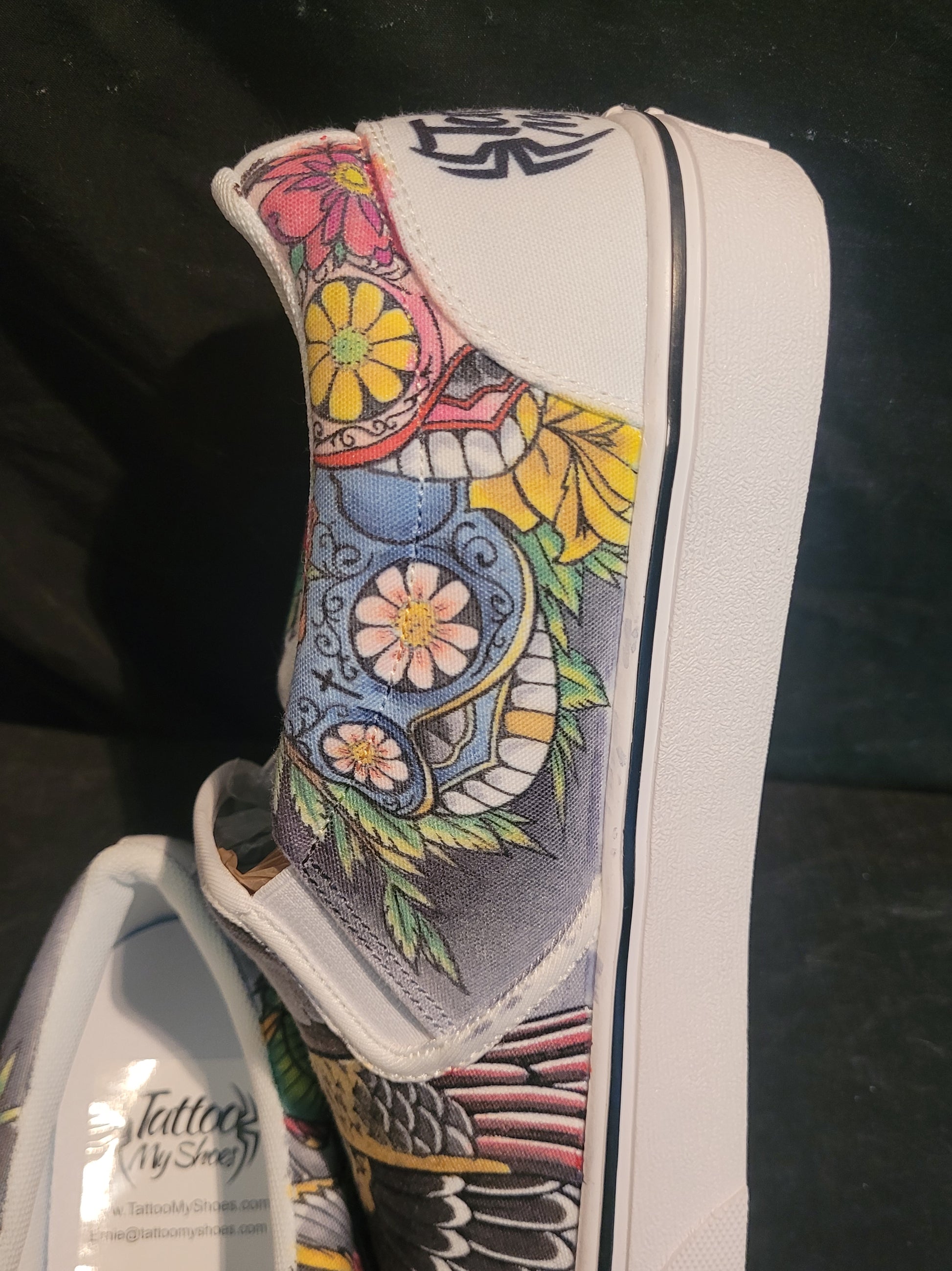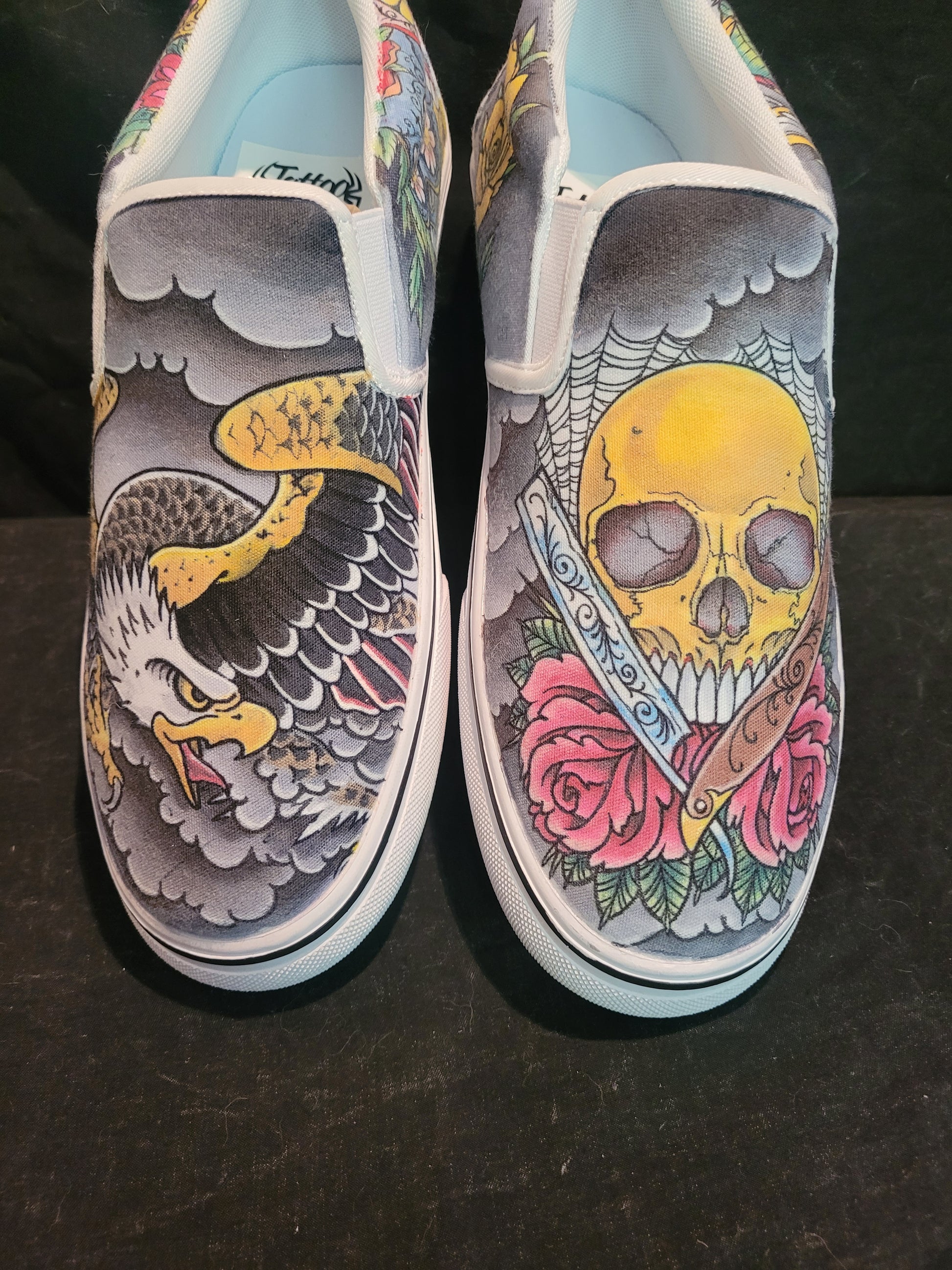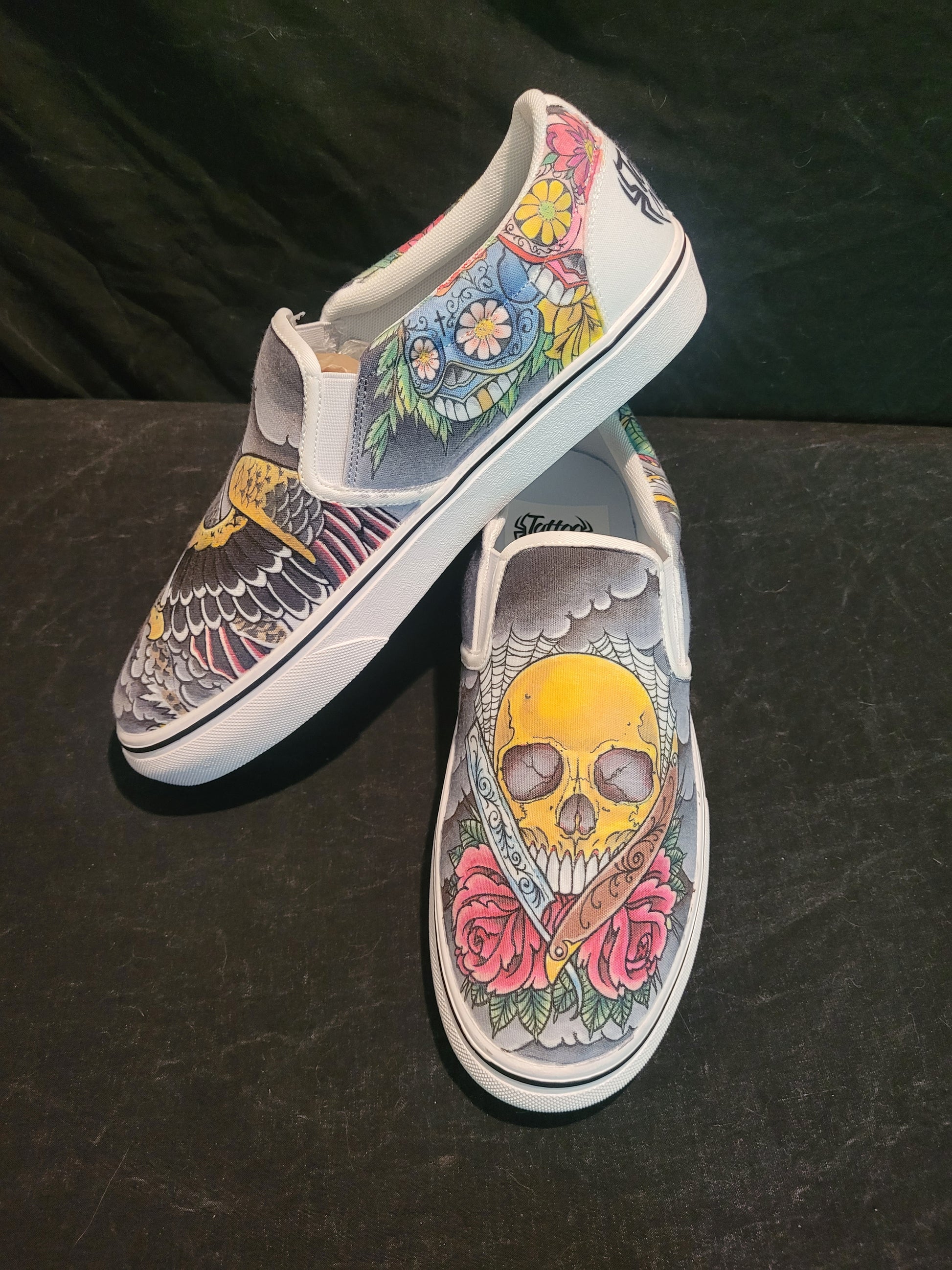 Elevate your style with these slip on shoes, featuring a stunning hand-drawn skull and eagle design by artist Ernie Moreno. Perfect for any tattoo lover, these shoes are sold exclusively by Tattoo My Shoes. Step out in unique, edgy style.