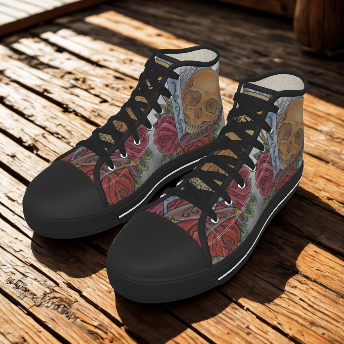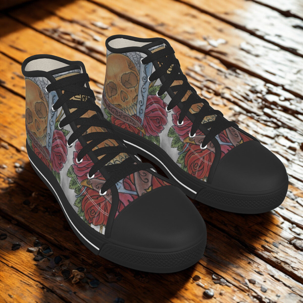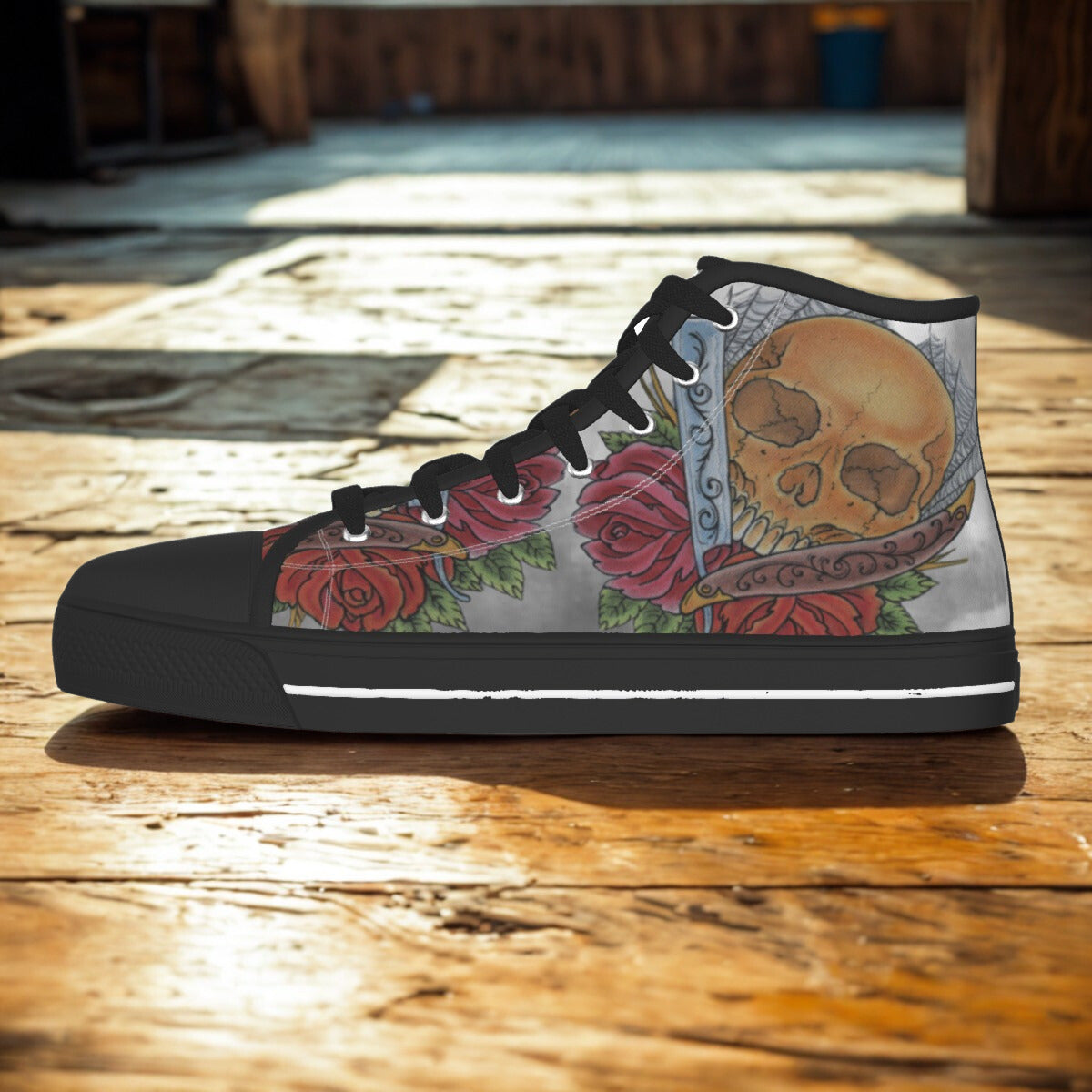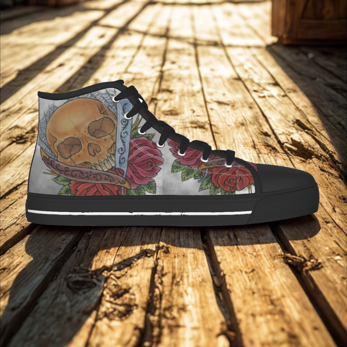 Make a bold statement with these Custom Printed Skull and Roses High Tops, featuring original hand-drawn art inspired by traditional tattoo designs. Vibrant colors bring the skull and rose motifs to life, while the durable, machine-washable fabric ensures your style stays fresh no matter where you go. Perfect for those who dare to stand out.