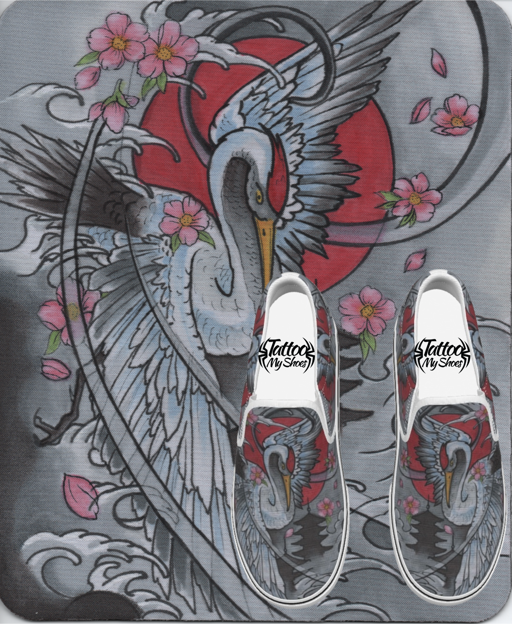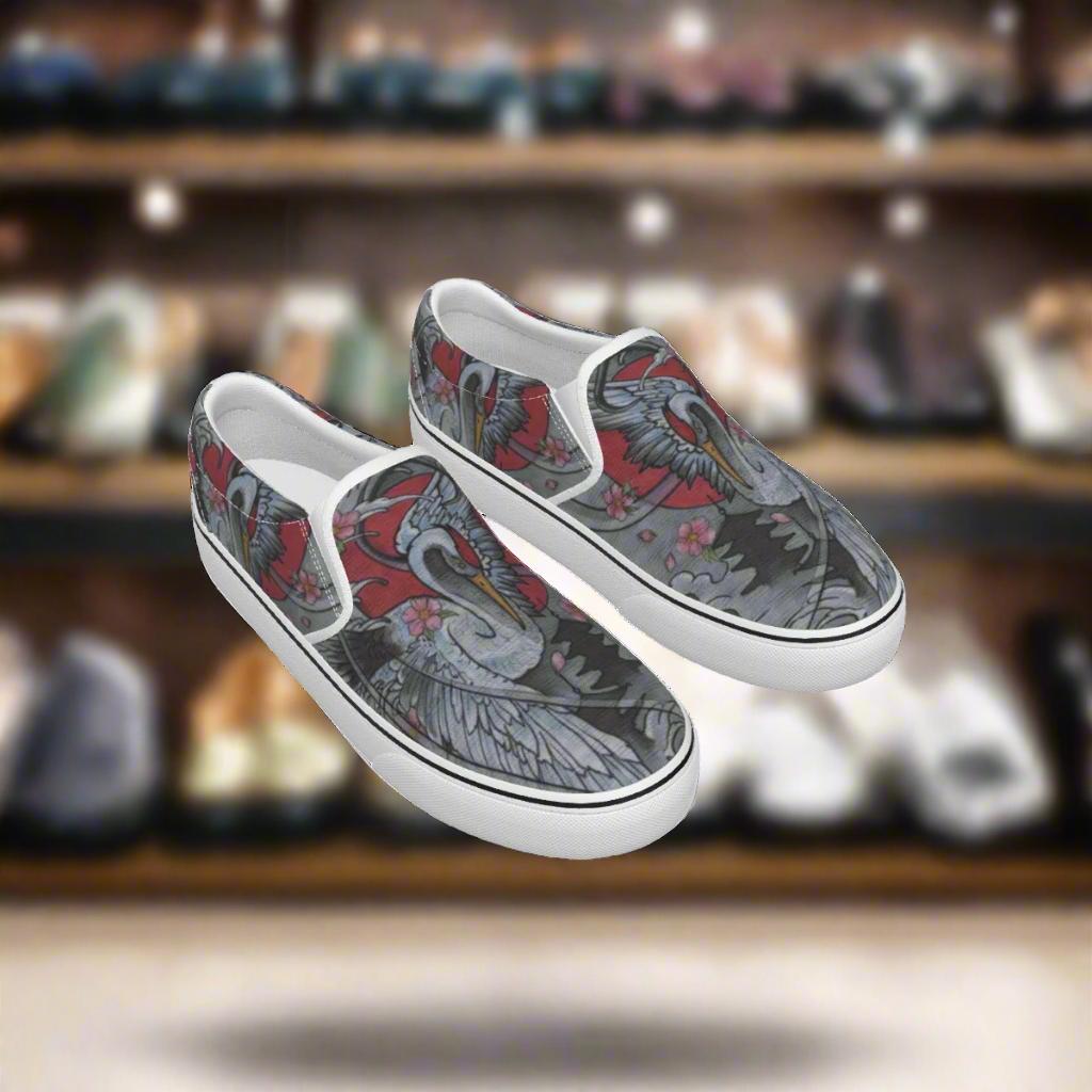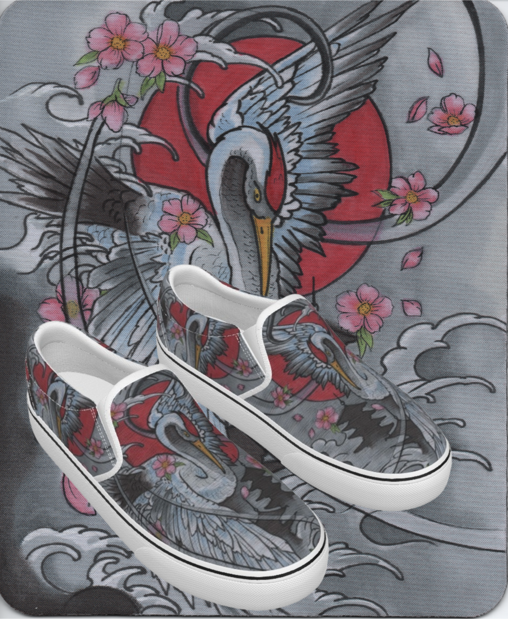Experience the elegance of traditional Japanese art with the Snow Crane slip-on shoes. Featuring original artwork inspired by classic motifs, these shoes combine cultural beauty with everyday comfort. Their slip-on design ensures easy wear, while the machine-washable fabric keeps them fresh and ready for any adventure. Elevate your style effortlessly with a unique blend of art and practicality.